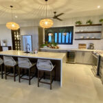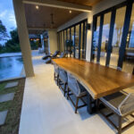 3 master suites have en suite bathrooms. This configuration offers flexibility for any type of group. Fully equipped kitchen and outdoor dining area. Large infinity Bali-Style pool. Ocean view Palapa or Shala provides an ideal wooden covered deck for fitness or morning practice. Large carport and plenty of easy access parking.